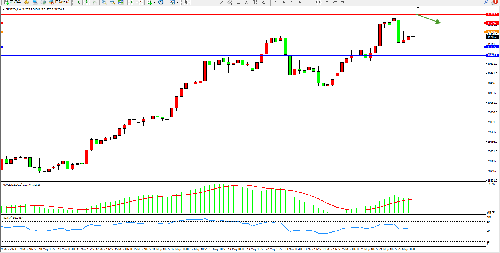 日经指数JPN225——4小时K线图显示:
