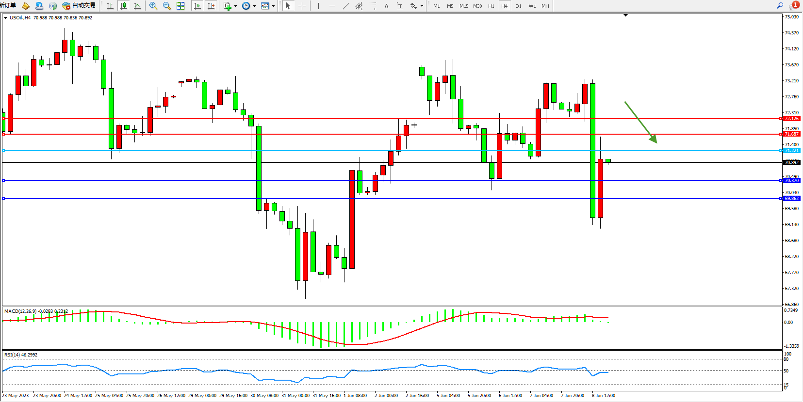 交易策略:71.221下方看跌,目标70.370 69.862