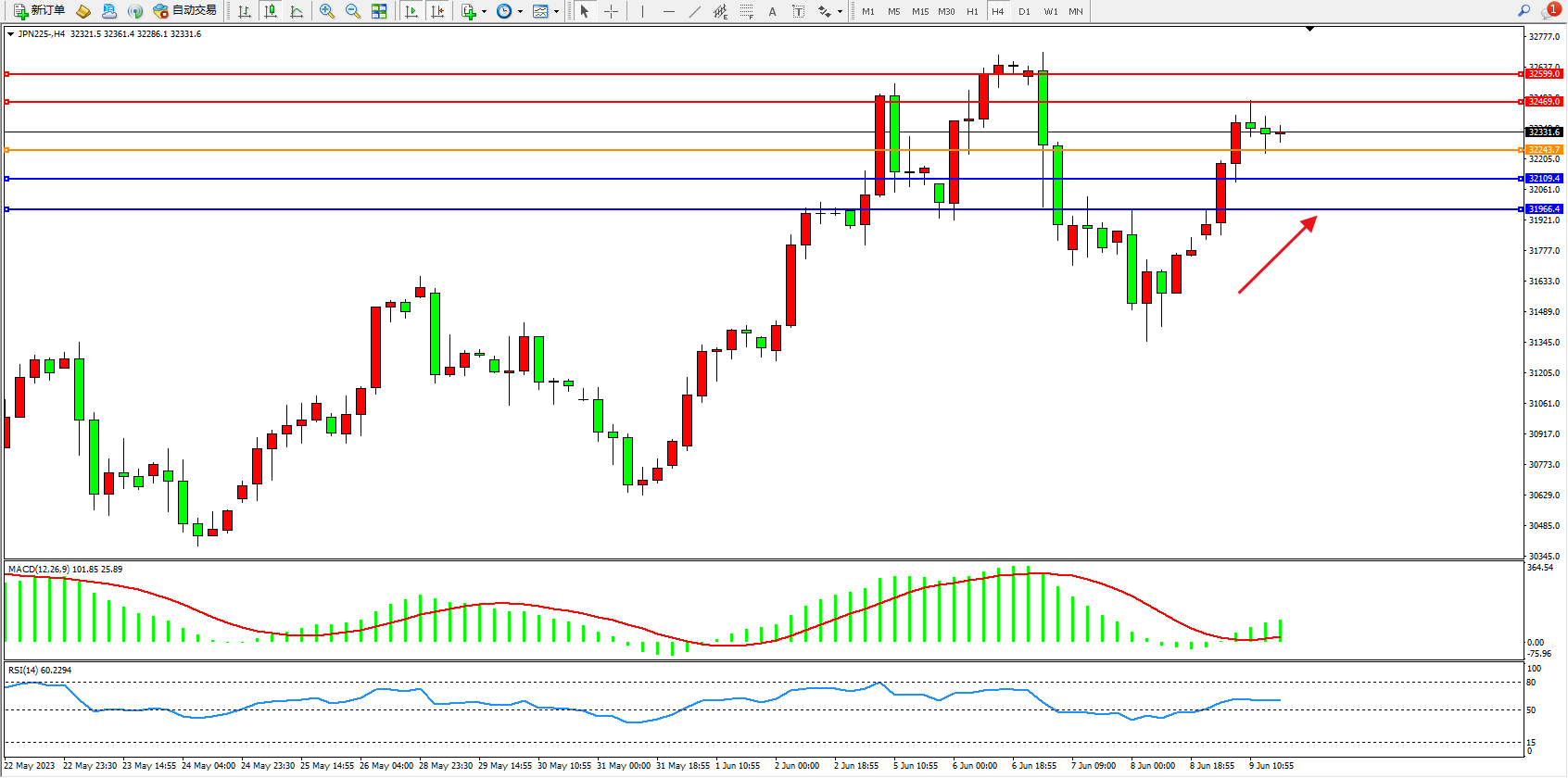 日经指数JPN225——4小时K线图显示: