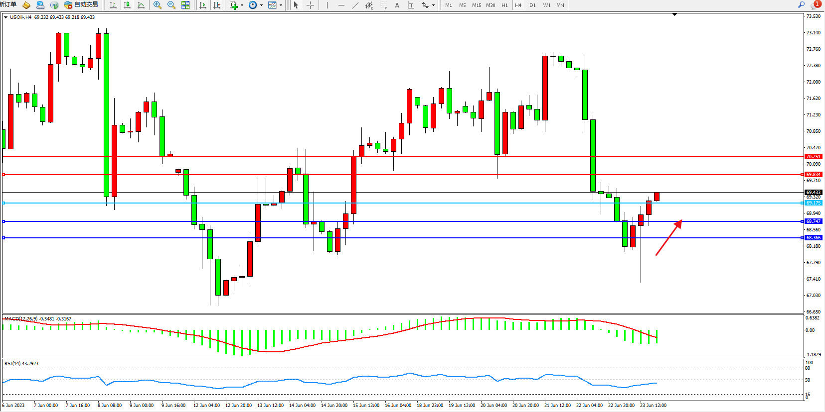 交易策略:69.175上方看涨,目标69.834  70.251