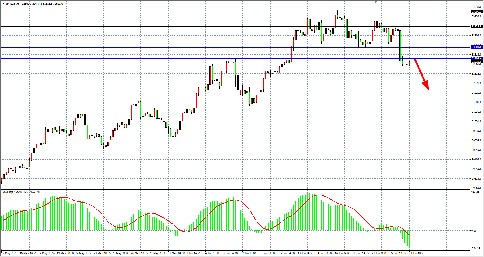 4小时图看,日经指数跌破33000点且进一步下行至32700之下,MACD量能在零轴下强势放量,趋势已走出顶部形态,阻力关注32700-33000,支撑关注32000-31400。