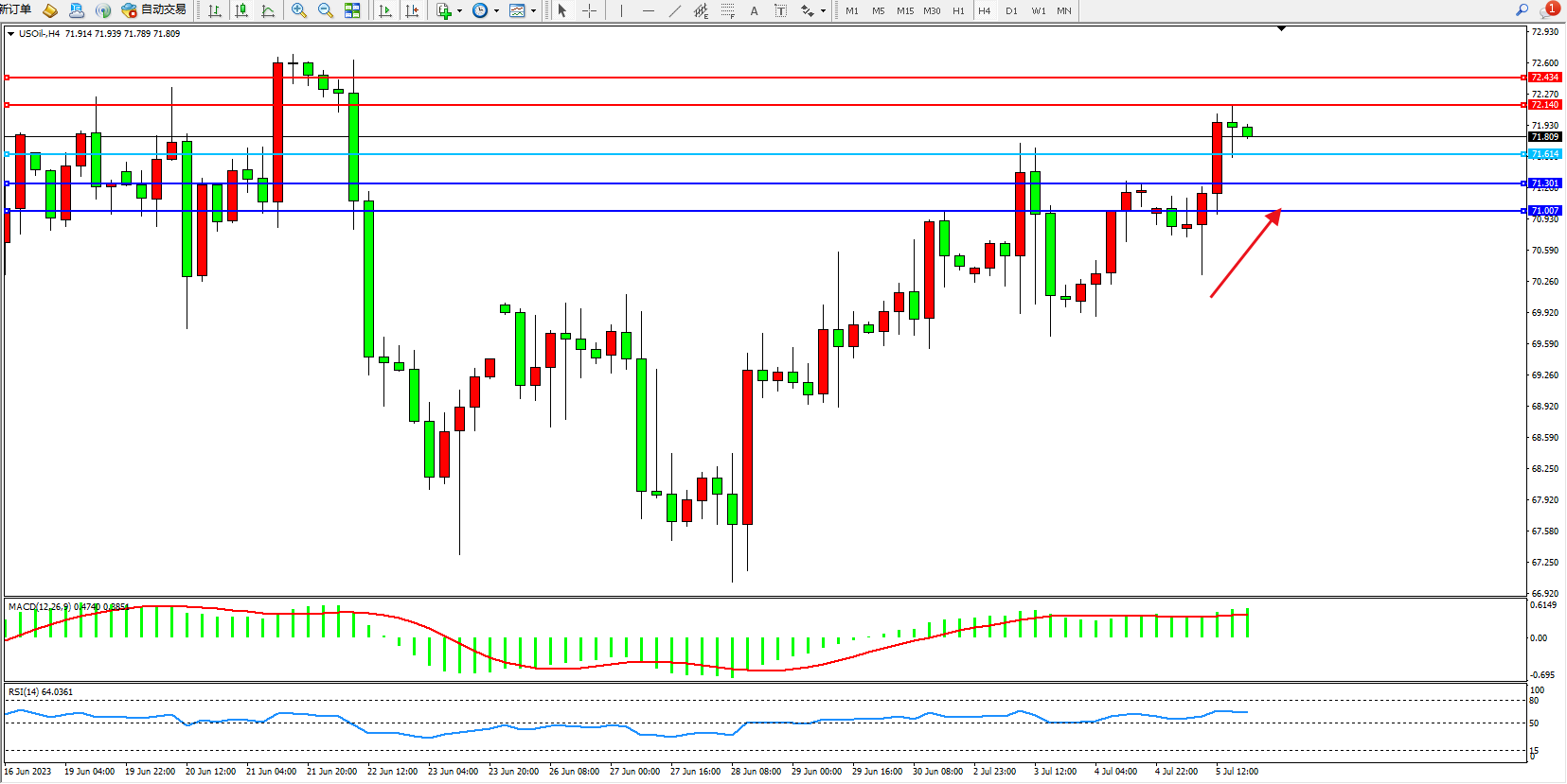 原油USOil——4小时K线图显示: