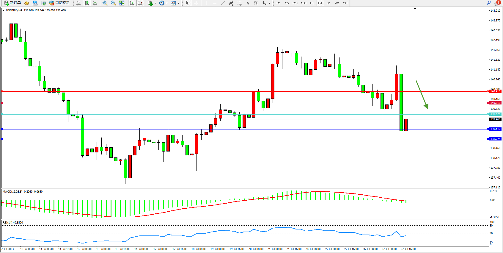 4小时图看:空头动力急速下跌,短期空头情绪笼罩,市场整体不断向下移动中,MACD指标处于0轴线下侧弱势徘徊,RSI指标处于50均衡线下侧弱势整理;