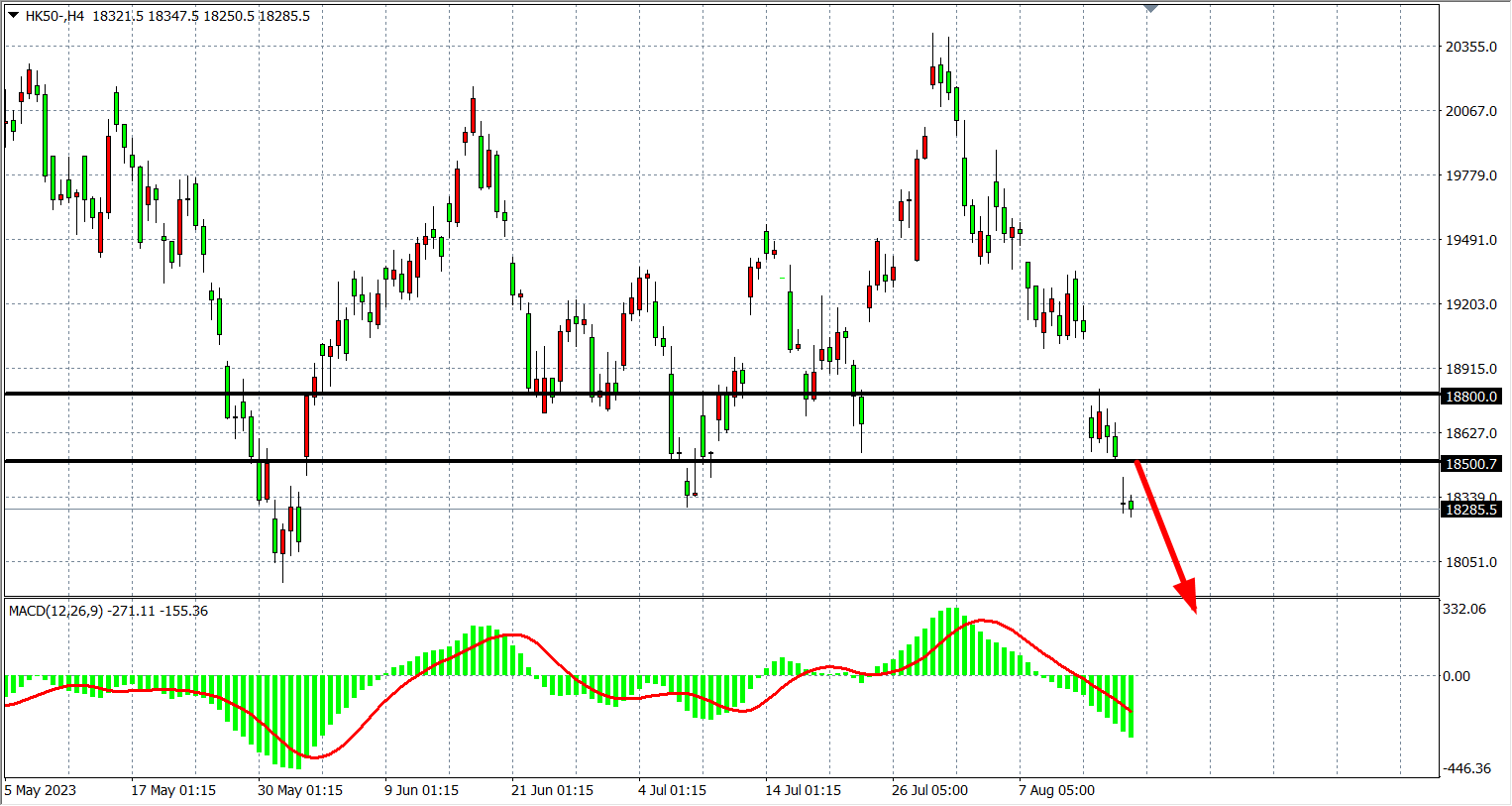 4小时图看,恒指继续下行跌破18500,MACD量能继续于零轴下方,阻力下移18500-18800,支撑关注18000-17800附近。