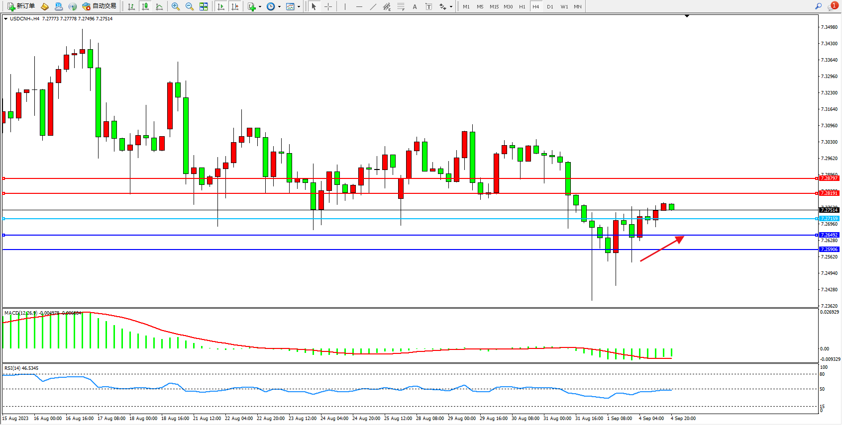 备选策略:7.27159下方看跌,目标7.26492 7.25906