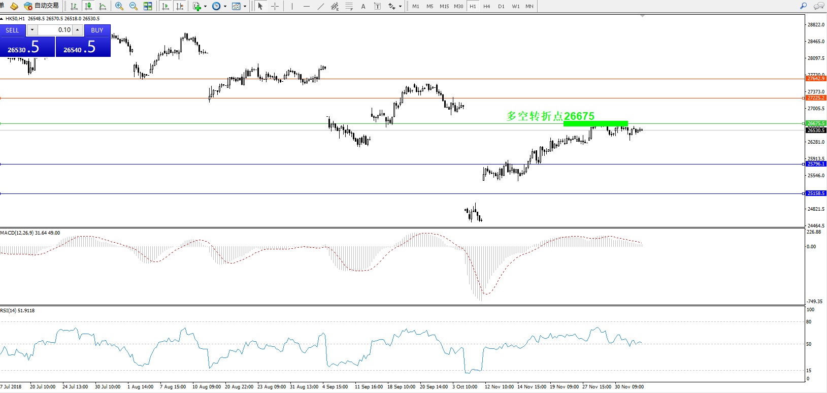 恒指HK50——1小时K线图显示: