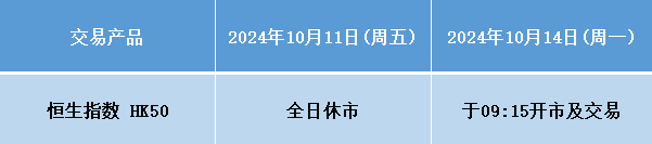 因应2024年10月11日(周五) 为香港重阳节假期,本公司以下产品的交易时间将于假期期间作以下安排,敬请留意。