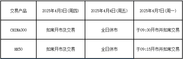 因应2025年4月4日(星期五)为清明节假期,本公司以下产品的交易时间将于假期期间作以下安排,敬请留意。