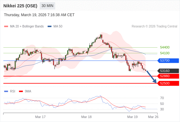 在 53700 之下,看跌,目标价位为 52880 ,然后为 52500 。