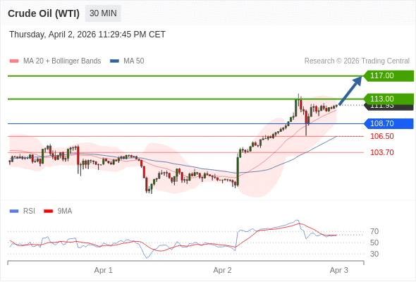 在 108.70 之上,看涨,目标价位为 113.00 ,然后为 117.00 。