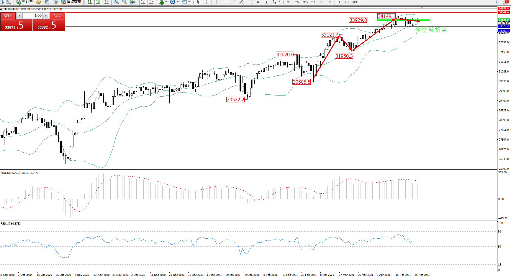 交易策略:33929下方看跌,目标33578、33307