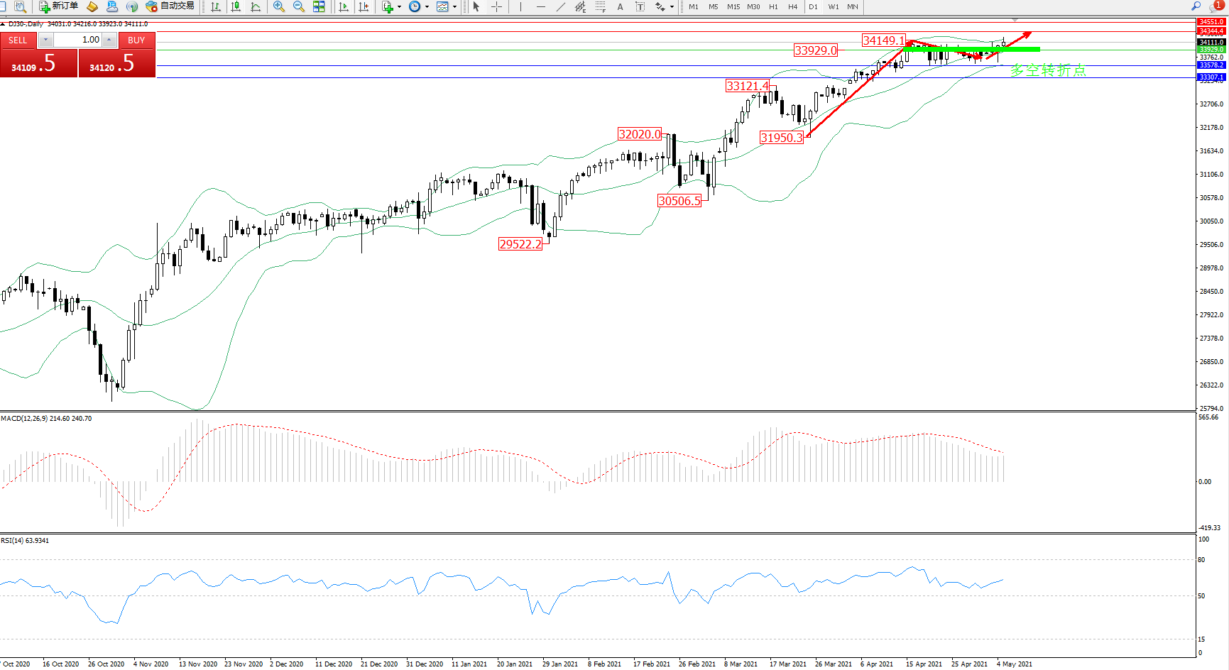 交易策略:33929上方看涨,目标34344、34551