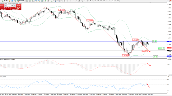 短期维持在布尔带指针通道中上轨区间窄幅整理后,空头动力伺机入场,急速下挫,跌破布尔带指标下轨至1.23043附近节点后整理,短期空头动力有继续下行态势,布尔带指标呈收口走势后开始缓慢张口,上方压制关注1.26053附近节点,低位支撑关注1.21274附近节点,关注1.23974附近转折点,MACD指标处于0轴线福弱势徘徊后开始有下移迹象,RSI指标处于50均衡线附近窄幅了后开始下挫,如图:
