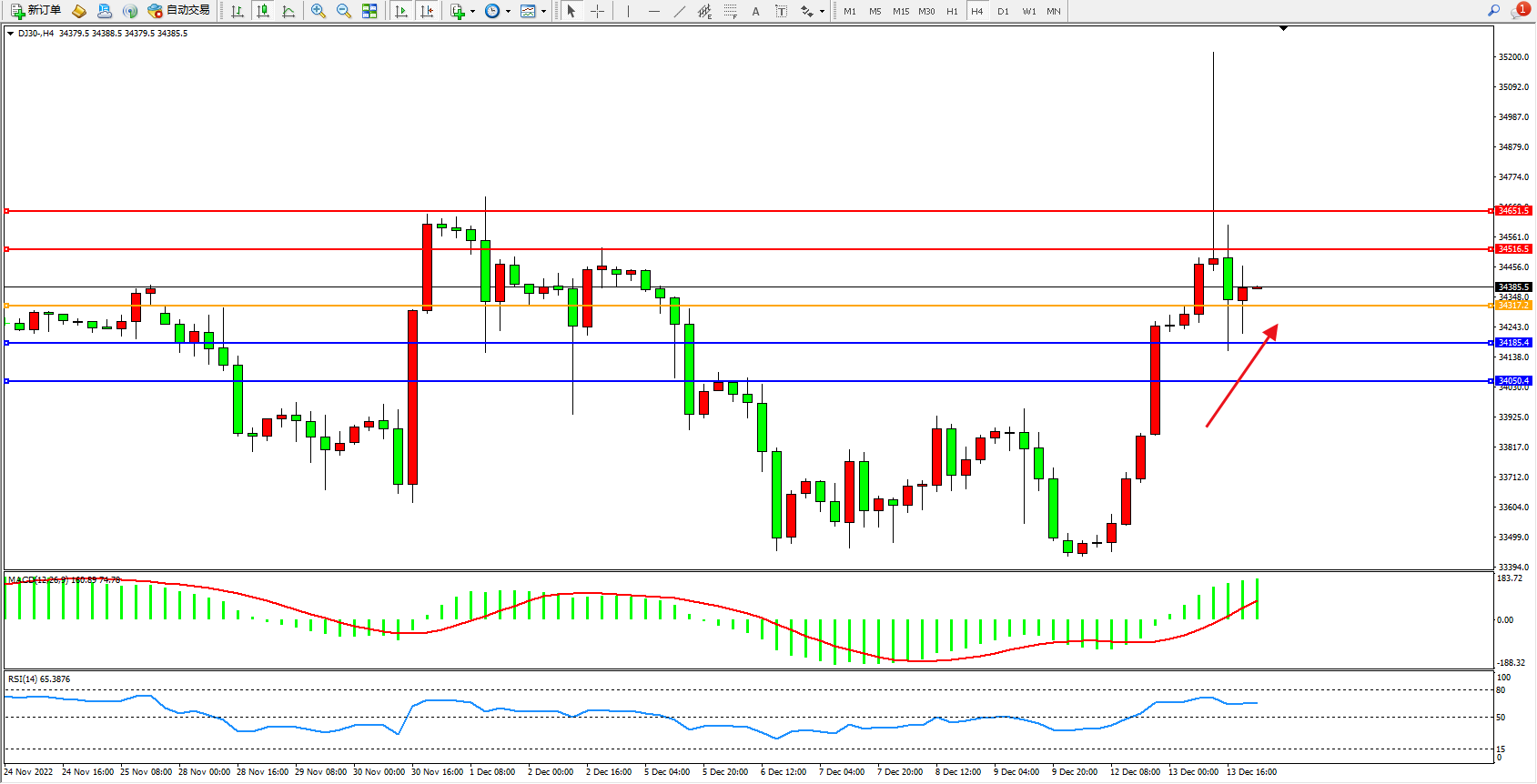 道琼斯指数DJ30——4小时K线图显示: