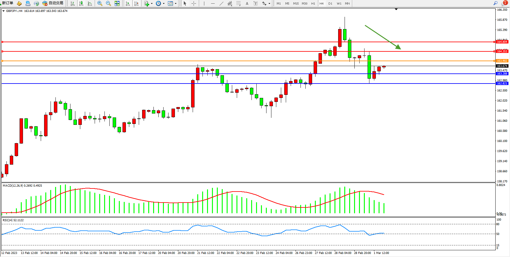 交易策略:163.902下方看跌,目标163.288、162.821