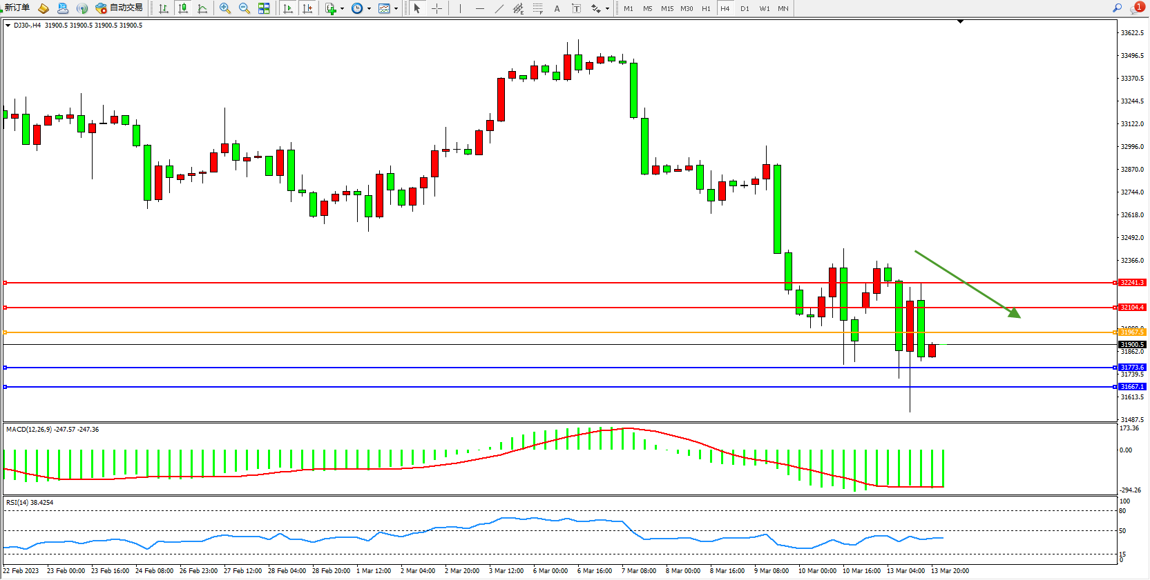 道琼斯指数DJ30——4小时K线图显示: