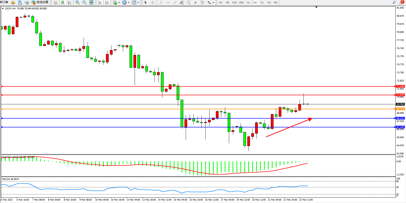 原油维持69.958附近震荡,EIA报告:03月17日当周美国原油出口减少9.5万桶/日至493.2万桶/日,美国至3月17日当周除却战略储备的商业原油进口量为2023年1月20日当周以来最低。