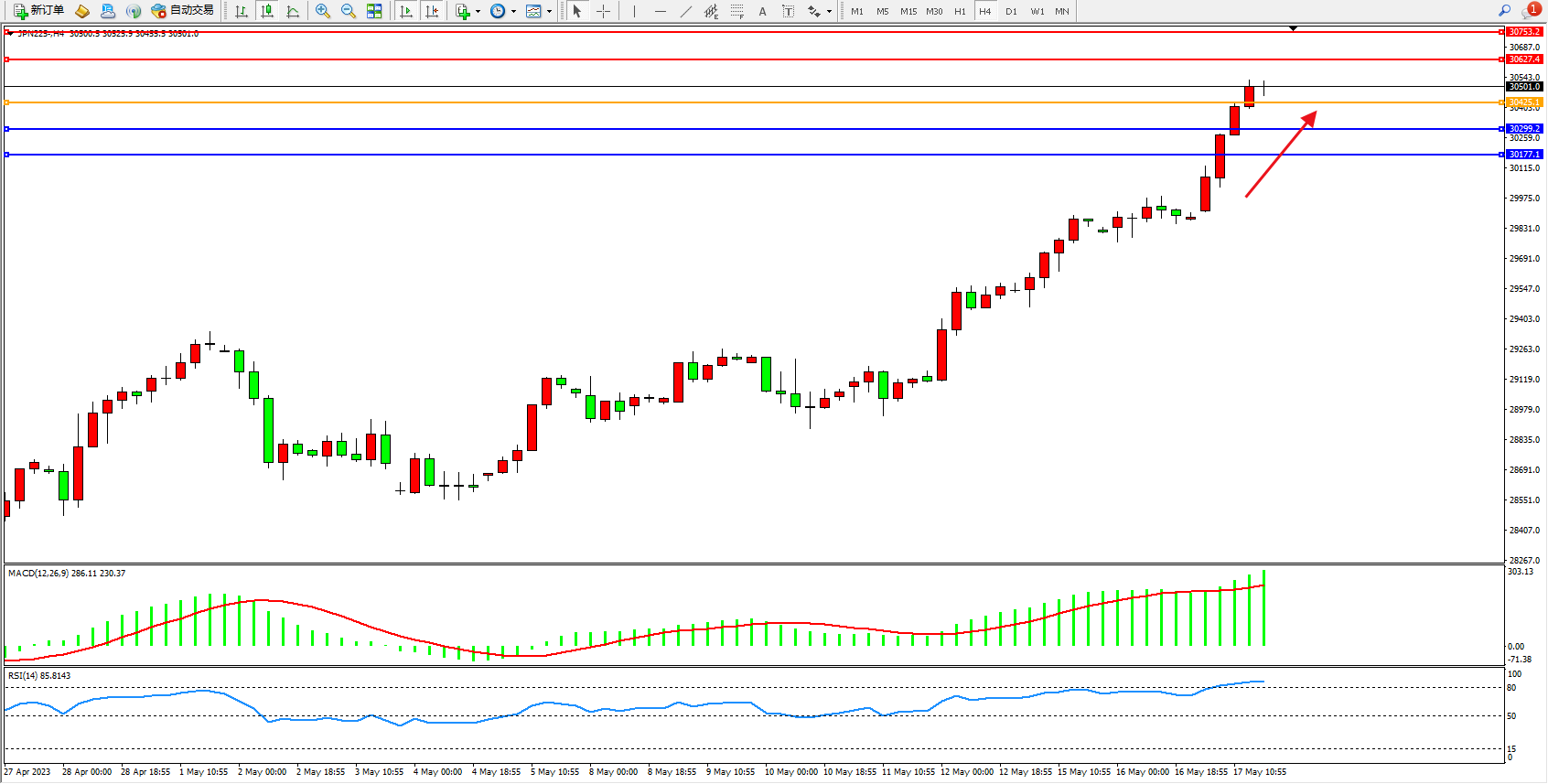 日经指数JPN225——4小时K线图显示: