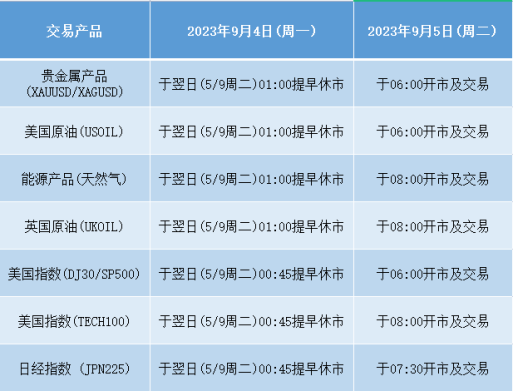 因应2023年9月4日(周一),为美国劳动日假期,本公司以下产品的交易时间将于假期期间作以下安排,敬请留意。